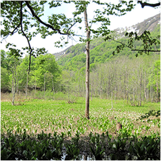 - ブナ新緑、ミズバショウ、ユキツバキ、オオイワカガミ、オクチョウジサクラ、 キヌガサソウ、トガクシショウマ、サンカヨウ、